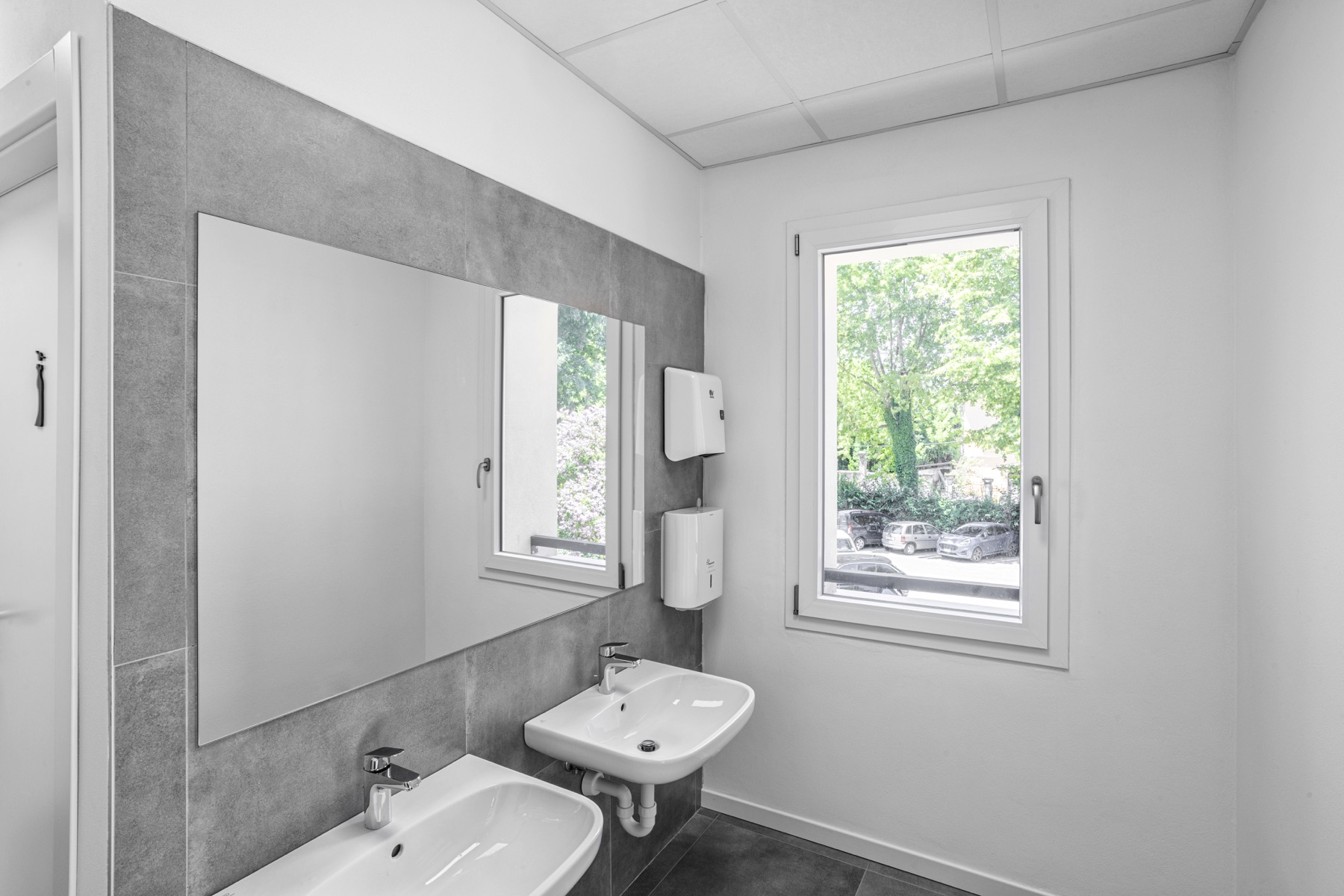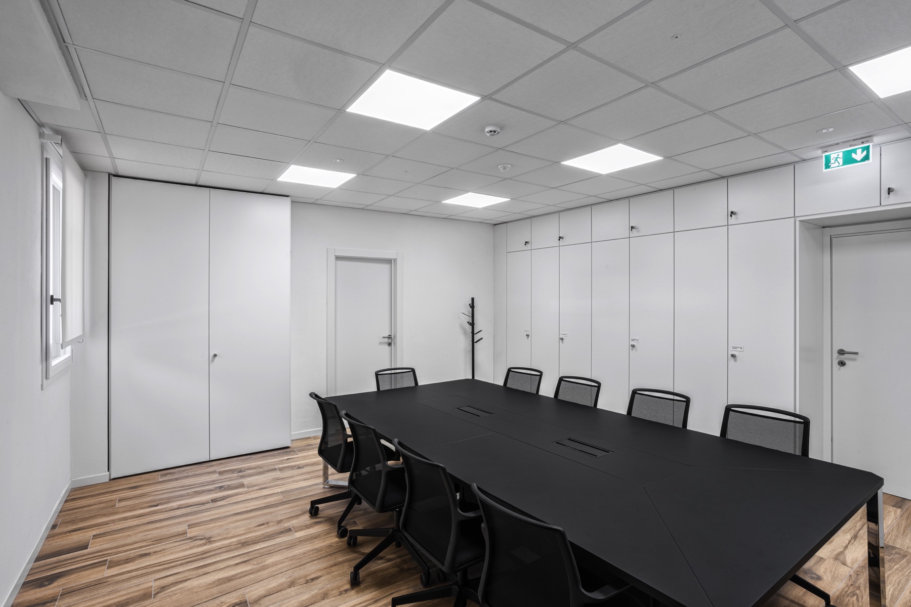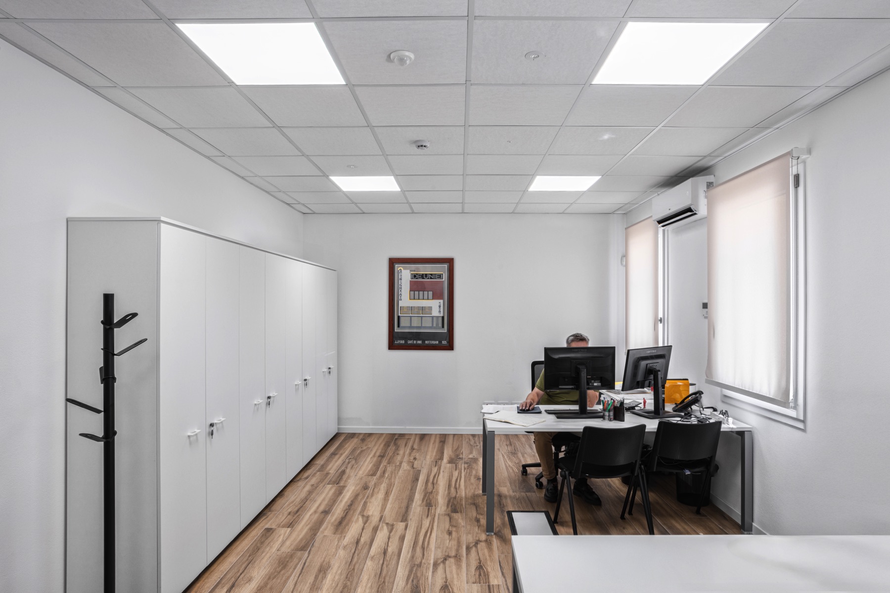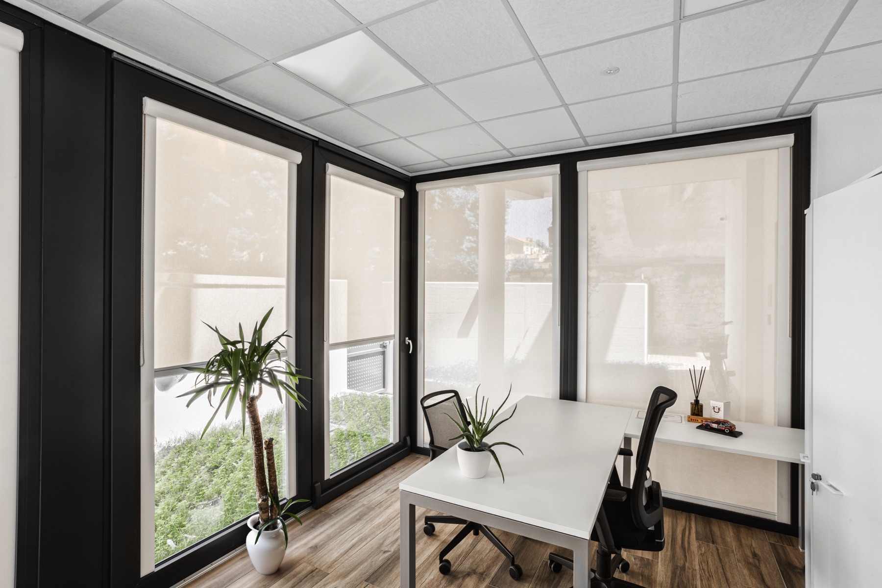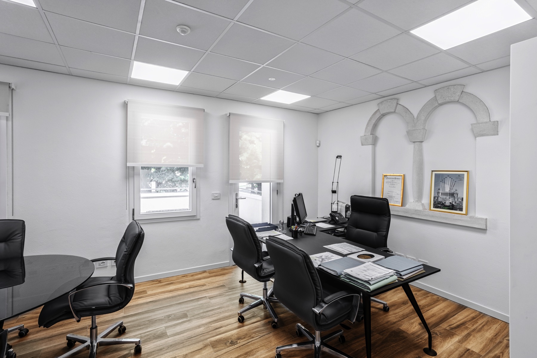 Particolare attenzione è stata riservata al comfort visivo: le tende a rullo installate in tutti gli uffici garantiscono privacy e controllo della luce naturale, senza rinunciare alla luminosità.