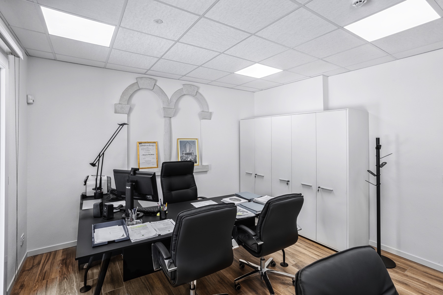 Pareti armadiate su misura per archiviazione ordinata e funzionale, postazioni operative modulari complete di cassettiere integrate e sedute ergonomiche, tavoli riunione per spazi meeting pratici e versatili, tende a rullo tecniche per il comfort visivo e la privacy, complementi d’arredo e specchi per armonizzare l’ambiente